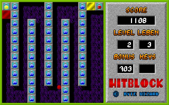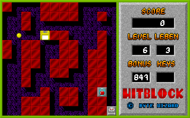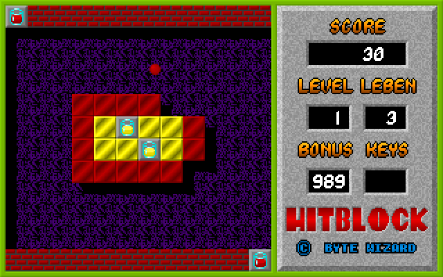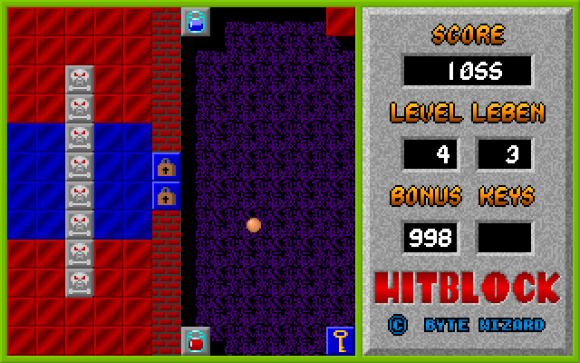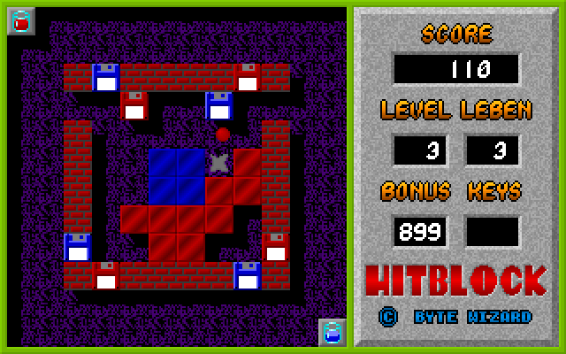 HitBlock is an arcade/puzzle game modelled after Crillion. It is somewhat similar to Breakout because the player's objective is to remove all coloured blocks from the screen by using the ball, but here, the ball is controlled directly by the player, without the use of a paddle, and will only break blocks of the same colour as the ball itself. Since blocks come in several colours, there are special colour-changing blocks that will recolour the ball into their colour when it touches them. There are also blocks that look like 3.5" disks, which cannot be destroyed, but the player may push them around, and deadly blocks that will destroy the ball if it touches one. All these elements allow to create various puzzles that require both thinking and dexterity, as the bouncing ball needs to be carefully manoeuvred around the playing field. Author Georg Rottensteiner released HitBlock as freeware. The game includes 40 levels and a level editor (with additional slots for up to 59 more user-created levels).