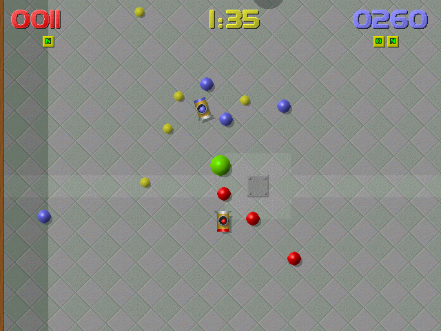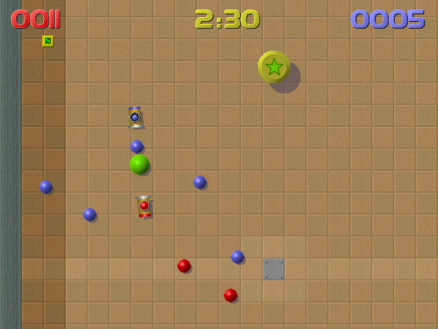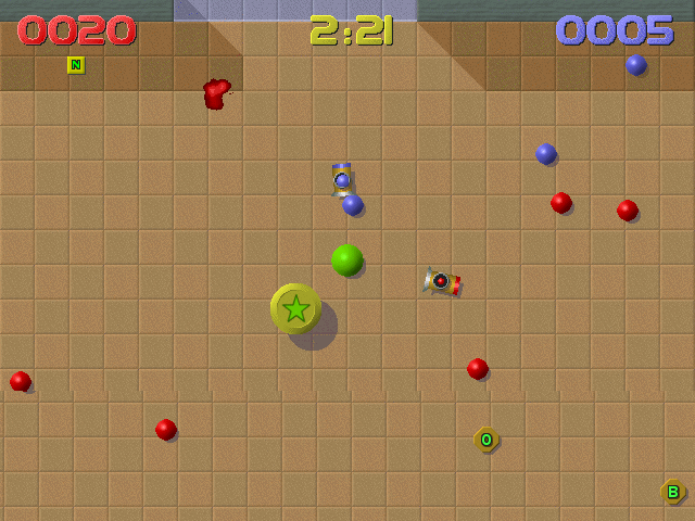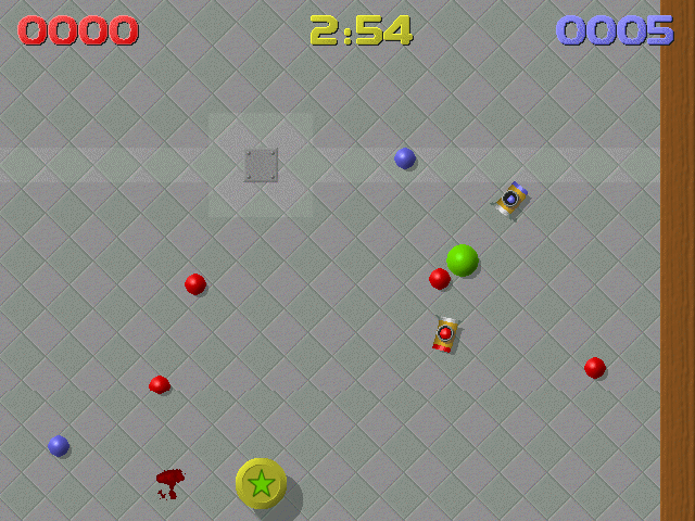 Trick Blast is an experimental game that could be best described as a hybrid of pool and soccer. The player and the AI opponent control cannons that move freely on the playing field and can shoot small balls in the direction of the big green ball, the objective being to steer the ball thus into the opponent's goal while keeping your own safe from it. This may not sound much, the the resulting gameplay is easy to learn, fun and almost addictive. Points are scored not only for goals, but also for keeping the ball on the opponent's side of the playing field. Additionally, there are various bonuses that the players can pick. The game offers single match and tournament modes, and can be played against the AI or between two users at the same computer. Trick Blast was created with DIV Games Studio and originally submitted as an entry to the DIV Competition 2000.
