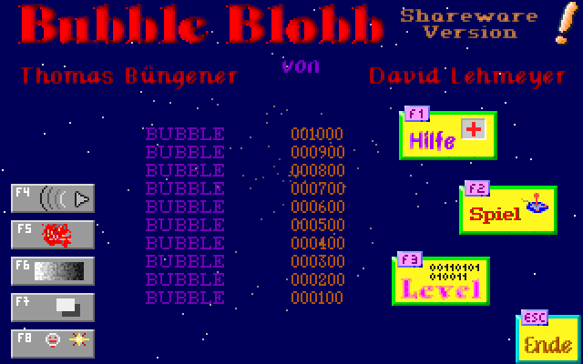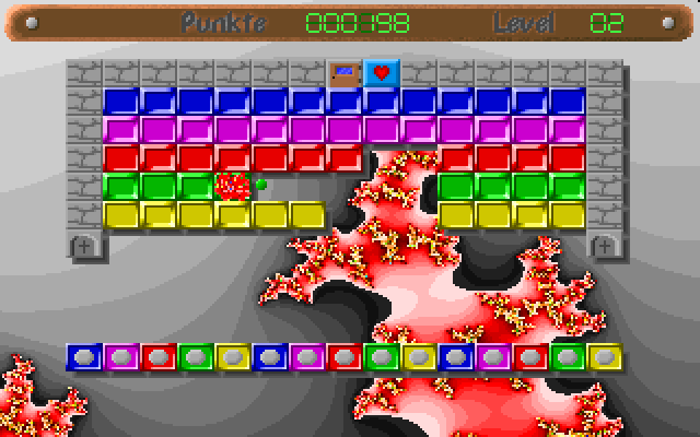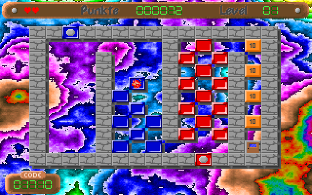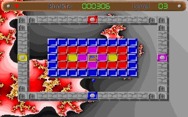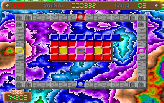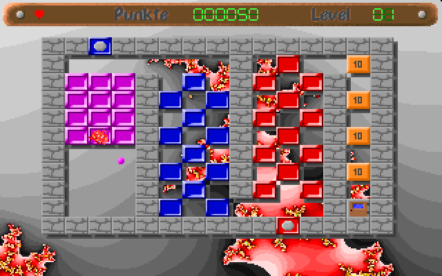 Bubble Blobb is an arcade game somewhat similar to Breakout: the main objective is to clear the playing field of bricks/blocks by breaking them with a ball, however here the player controls the ball directly instead of using a paddle. Another new rule is that the ball can only break bricks of the matching colour, but you can change the ball's colour by bumping it into special blocks present on the field. The goal of each level is to reach the exit while breaking as many blocks as possible and scoring as many points as you can. This is complicated in many levels by the presence of hazardous blocks that must be avoided. Other special blocks contain bonuses like extra lives. The shareware version of Bubble Blobb prompts you to enter a code at the start, similar to copy protection in commercial games. This is for the registered users, and simply pressing Enter twice will start the shareware game.