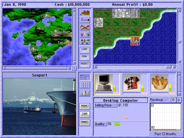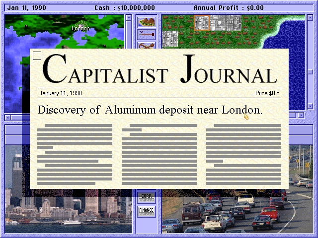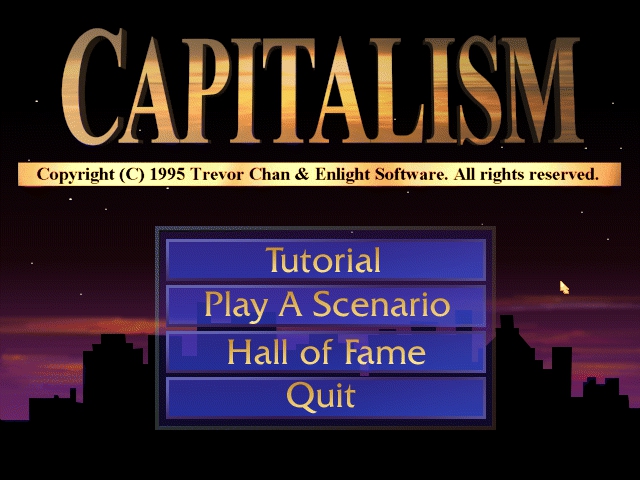 Capitalism is a SuperVGA real-time business strategy game that simulates the modern business world with unprecedented depth and sophistication! You would be astonished by the vastness of its scope which covers retailing, manufacturing, mining, farming, management, marketing, financial management, accounting, economics and stock market ! In Capitalism, dreams are no longer dreams, things that seem impossible in real life are all too common in Capitalism.