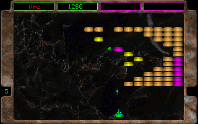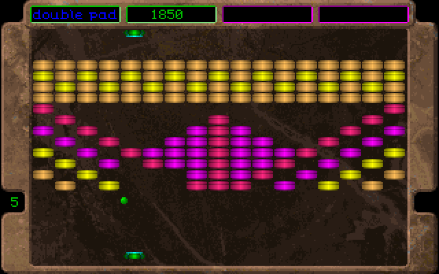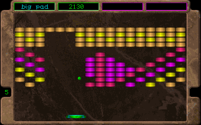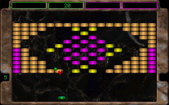Break It is a Breakout like game for one or two players. The rules are fairly standard: bounce the ball with your paddle to break all bricks on the screen. Some bricks will drop bonuses, and here is the main catch of this variant: you can have only one active bonus at a time. Even if you pick an extra life or extra score, any other active bonus you might have will be cancelled. Sometimes a random "surprise bonus" will appear, looking like a question mark. Picking this might yield an advantage, but just as well it could be a negative bonus, like instantly losing one life, or restarting the level. You can press F1 at any time to save the game, but it will only store the current score and number of lives. Otherwise loading a saved game will reset the level and start the player with no bonuses. Break It was marketed as shareware. The registered version contained 99 levels and a level editor.