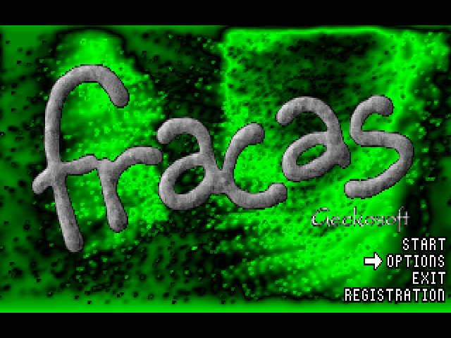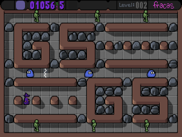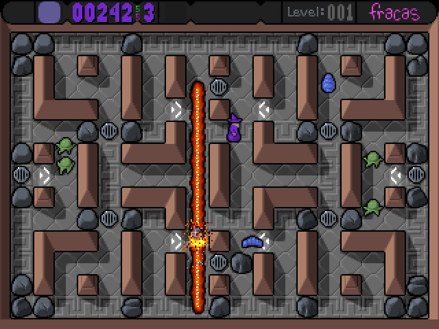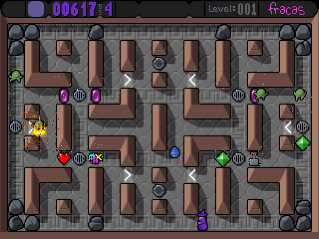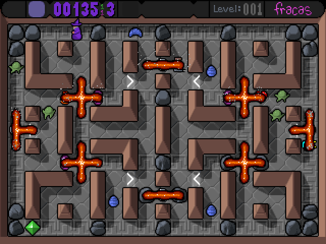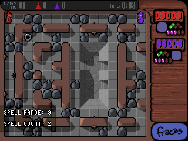 Fracas is a Bomberman style arcade game for up to four players featuring wizards and magical creatures. The core mechanics are very similar to Bomberman: the wizard finds himself in a labyrinth filled with dangerous monsters, and must carefully use spells to clear each level of these hazards. For this purpose, cauldrons with spells are placed on the ground which explode after some time, destroying both rocks, monsters and the wizard as well should he remain in the path of the blast. Some rocks will reveal powerups when destroyed, which increase spell power, add lives or boost other abilities of the player. However, removing rocks may open new paths for the roaming monsters, which are usually isolated from the player by obstacles at the start of a level. While monsters do not actively seek out the wizard, they will move along any free path they find, and also destroy any powerups in their way if the player does not pick them first. There are other hazards including one-way tiles or lightning bolts that block the way. Fracas was originally sold as shareware, with only a few levels available in the unregistered version. On 6 March 2005 the authors made the full game available as a free download.