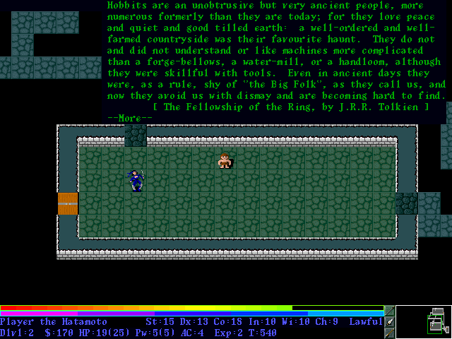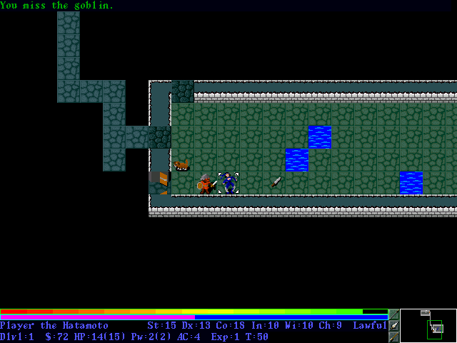 AllegroHack is a graphical user interface for NetHack that utilises the Allegro library (hence the name). It allows to play with large graphical tiles at a variety of screen resolutions, and adds advanced graphical effects like dynamic lighting. Gameplay is not changed compared to vanilla NetHack.