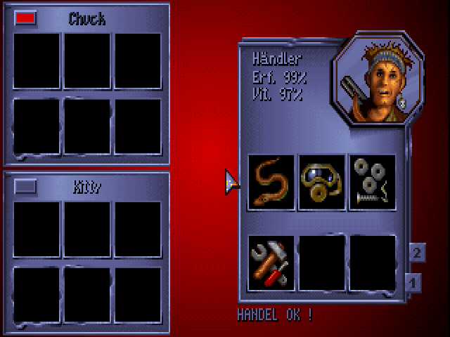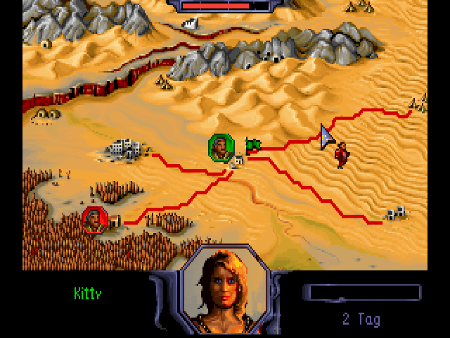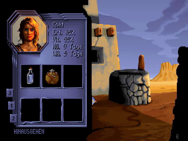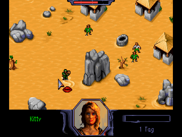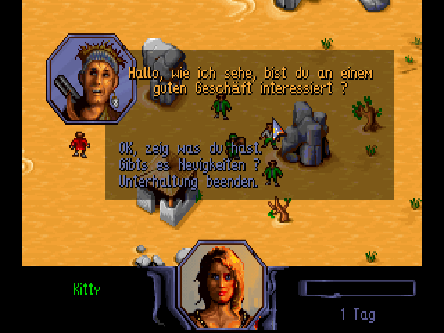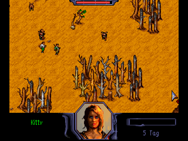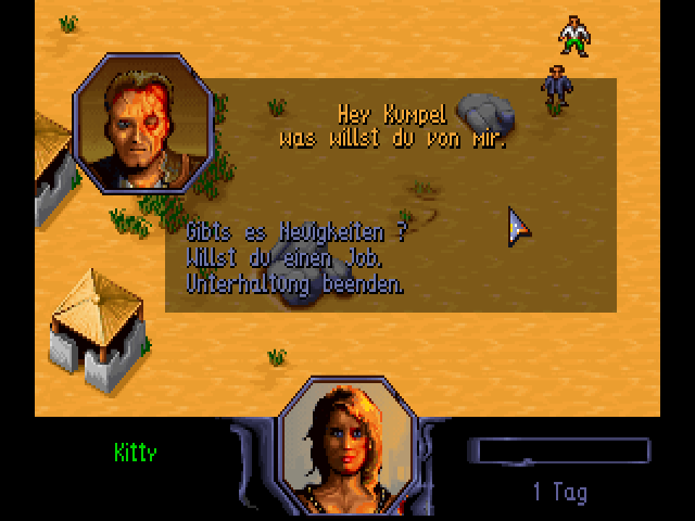 Burntime is a role-playing strategy game in a post-apocalyptic setting. In some ways, it is similar to Cryo Interactive Entertainment's Dune: you start with one character but eventually recruit more followers to your party, using them to explore, fight and capture locations on the global map. Useful items found along the way may be used for your own survival or traded with merchants for other goods. Game play is split between moving around the global map and exploring each location. Characters are controlled with the mouse. Once you arrive at the desired location, left-click on your character icon to enter and explore it. Useful items may be found lying on the ground, in houses or other places. You will meet various characters, some of which may join you but will ask an item in return. There are three types of followers: warrior, technician and medic. If you leave some of your party members in a location, it will be under your control and produce goods for your faction. The playable demo was released sometime before the full game, and is entirely in German. You can load a test saved game, or start a new game by typing your character's name and selecting a portrait.