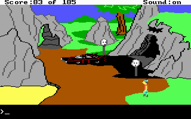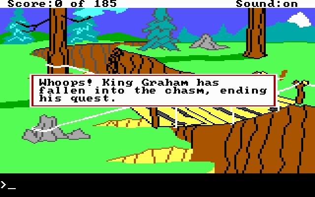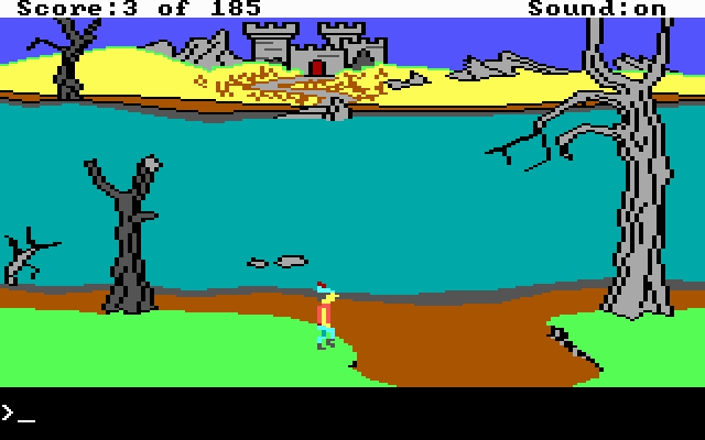 After having recovered the three treasures, King Graham has been crowned king. Now having needing a queen for companionship, Graham searches the land for a maiden, but to no avail, so he turns to the magic mirror for help. The mirror shows him a beautiful girl locked away in a quartz tower in a faraway land of Kolyma, and must find three keys that are used to unlock the door that will lead to her. King's Quest II: Romancing the Throne is a graphic adventure game. As is typical for Sierra's AGI games, players move Graham around with arrow keys and perform actions by typing commands in the interface, which are usually a verb/noun sequence. Like the first game, a good knowledge of fairy tales is required to solve some puzzles.