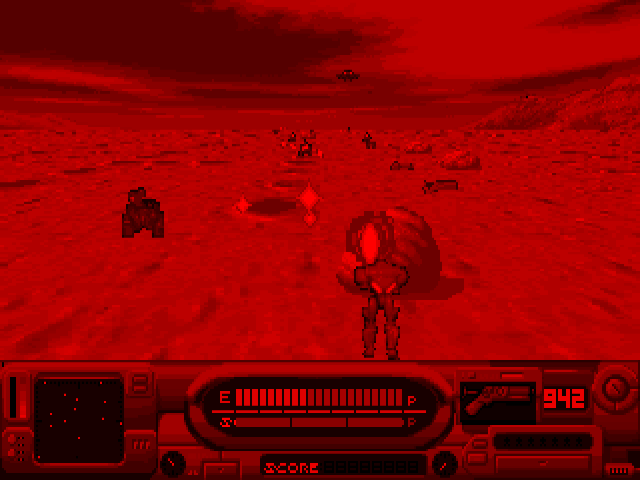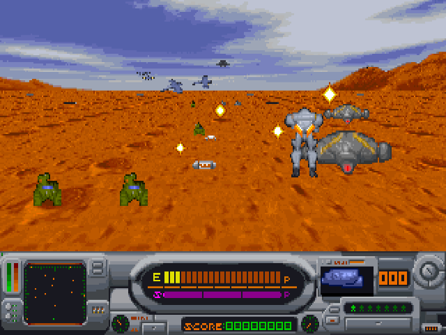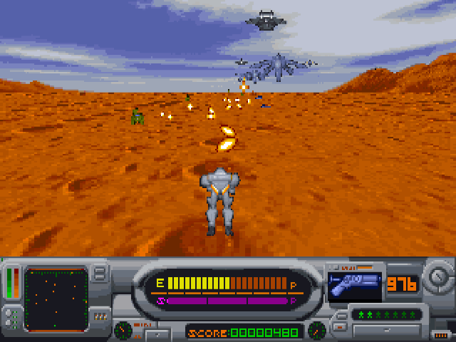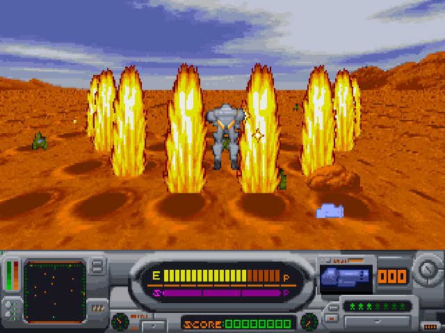 Izmir is an on-rails third-person shooter in a futuristic setting. The eponymous Izmir is the name of the world state that emerged in the 21st century, which is at war against a paramilitary criminal organisation. The player controls a fighter in powered armour who must plough through advancing hordes of enemy robots. You constantly move forward and can only step sideways, but also use a jetpack to fly over obstacles. Ammo is finite and you need to keep an eye on powerups and/or switch between available weapons.