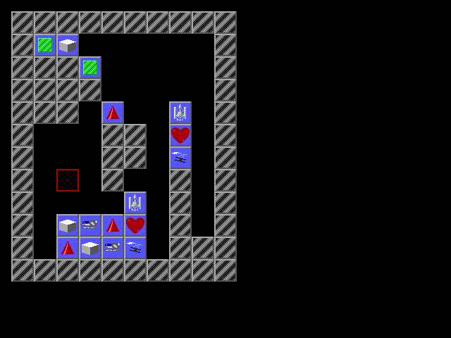 Push 'em is a tile-matching puzzle game inspired by Taito's Puzznic. The player's objective is to clear the screen of all blocks by pairing two or more with the same image. Blocks can be moved horizontally and will fall down from heights, but cannot be moved up by the player. As such, solving each puzzle requires to carefully manoeuvre the blocks so that they do not get stuck without the possibility of retrieving them. As the game progresses, puzzles involve more and more blocks, combining them in the ever increasingly tricky ways. Unlike Puzznic or Brix, there is no time limit to solve any puzzle. The game will reward the player with passwords from time to time, allowing to skip portions of already solved puzzles, but otherwise it does not keep track of the player's progress or score. Push 'em is freeware and comes with a level editor.