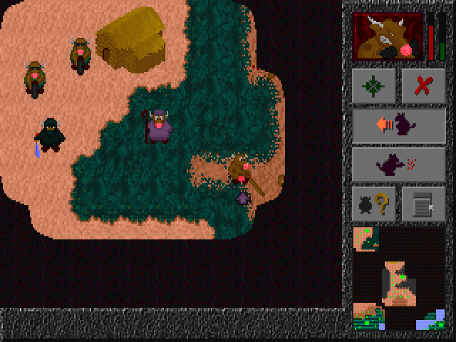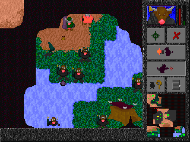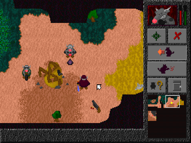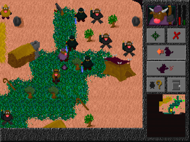 Crazy Cows is a turn-based tactics game where you control - you guessed it - squads of anthropomorphic cows that duke it out against each other (the teams are grey cows versus brown cows) using a variety of weapons like katanas, shotguns, bazookas, magic staves etc. This weapon diversity and the visual style will likely remind you of Cyberdogs/C-Dogs somewhat, but combat-wise the game leans towards Jagged Alliance. During each turn, you order your cows to either move or attack, which consumes movement points (MUs) until none are left for the current turn. If a cow is ordered to walk into a cell with a new weapon/gear, it will pick it up and drop the currently used weapon (if available). Thus you can change the cows' specialization, but it will deplete their MUs for the rest of the turn. Similar to Warcraft or Dune II, the map is initially covered in darkness and needs to be gradually explored by your units. The game has a single-player campaign, as well as skirmish mode for one or two players, and a level editor for user maps (about a dozen were created by fans and available from the authors' website). Crazy Cows was released as freeware.