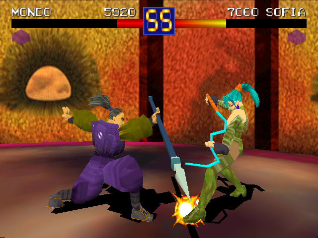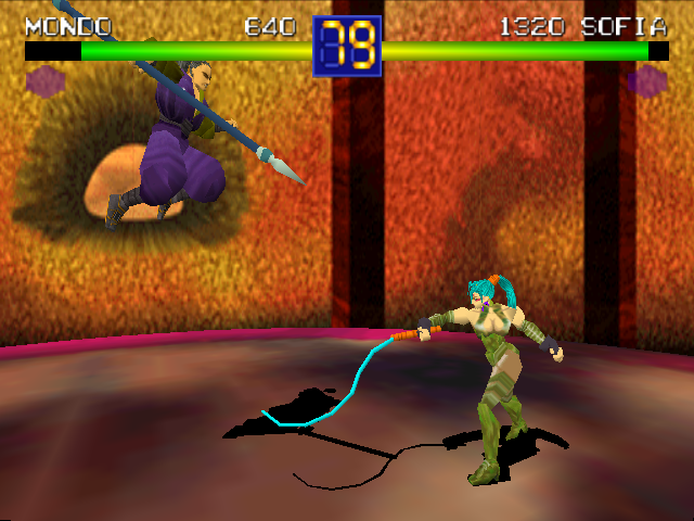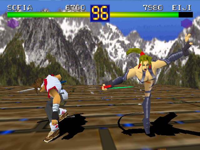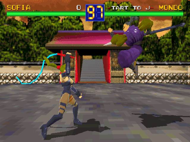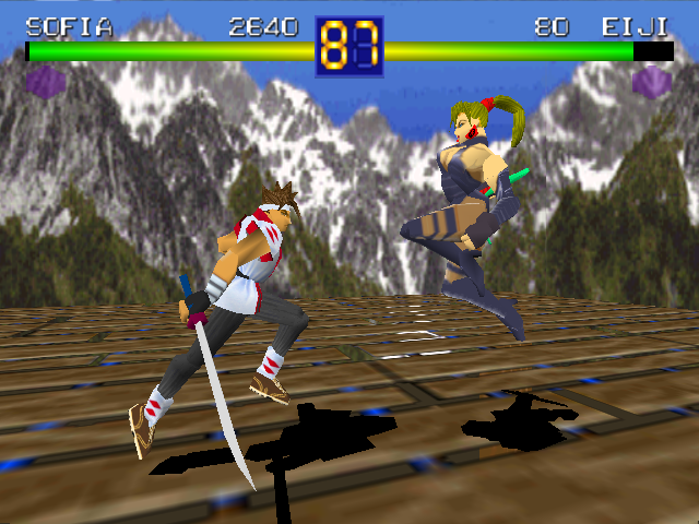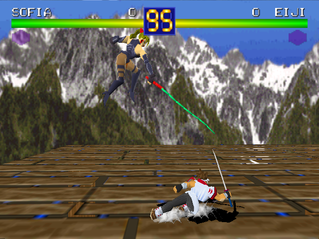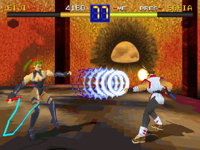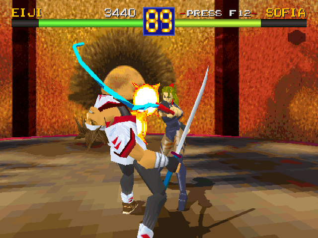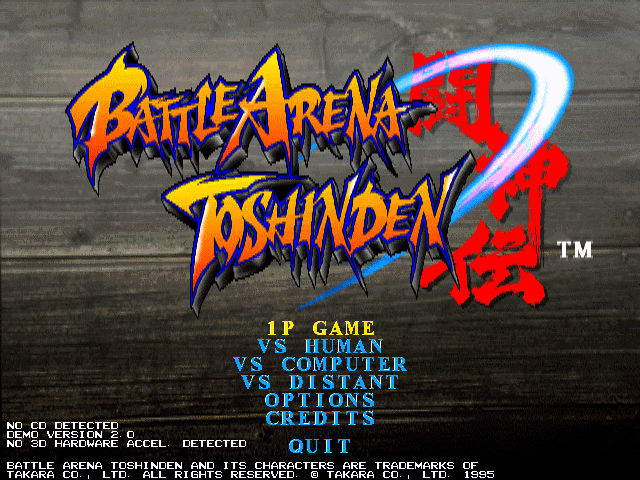 Battle Arena Toshinden is a Japanese versus fighting game. It features advanced full 3D graphics, allowing for different camera views on the battle. Every character is always armed with a unique weapon and uses corresponding fighting techniques, but ranged magic-like attacks that are typical for the genre are also present. The demo version allows to choose between three characters (with alternate costumes) out of eight in the full game.