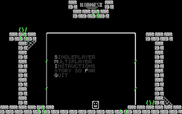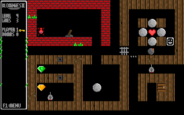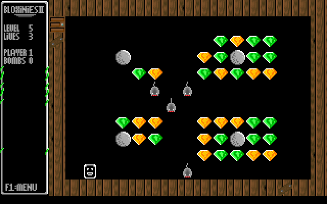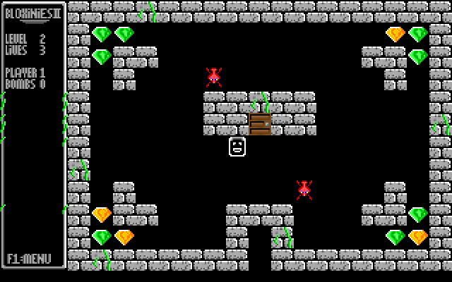 Bloxinies II is a sequel to Bloxinies that features generally similar gameplay, but updates the visuals to 256 colour graphics and adds a two-player mode. As in the original Bloxinies, the objective of each level is to direct the smiley face protagonist to collect all gems on the screen, which unlocks the exit door. This apparently simple task is complicated by the presence of enemies, traps and other obstacles. The two-player mode uses its own levels, and this time, both characters must reach the exit once all gems have been collected. In addition, the original Bloxinies level set is also included. The game was released as freeware and includes a level editor and the entire source code.