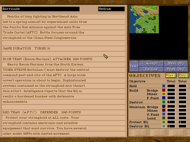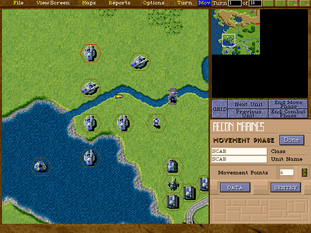 Front Lines is a futuristic hex-based wargame set in mid-2040s. After several decades of relative world peace, unity and economic growth, governments start to crumble as new, more radical powers emerge and start to aggressively shape a new world order by means of their own private armies. The game features the familiar playing mechanics comparable to those of Steel Panthers and other tactical-level wargames, but offers futuristic weaponry, armour and other technologies.
