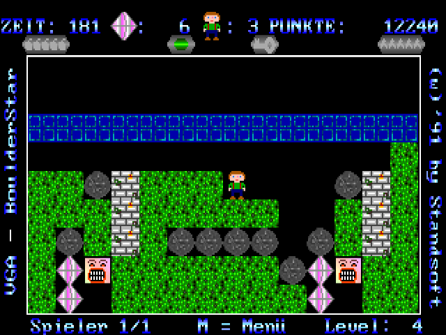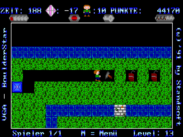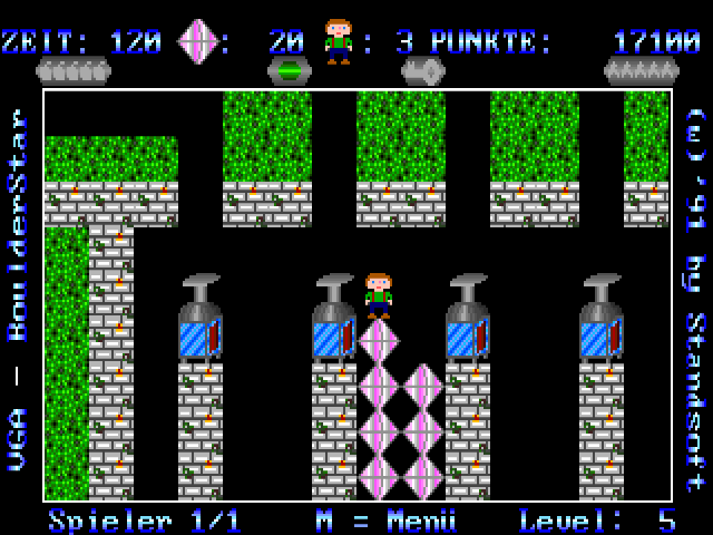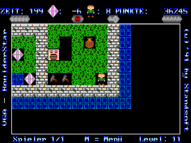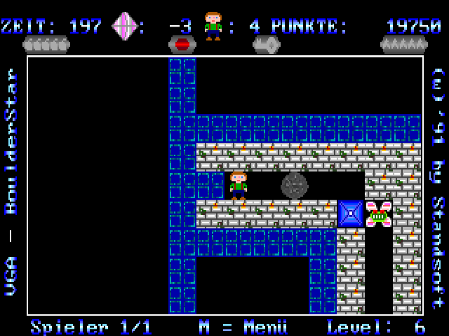This is yet another Boulder Dash clone that stays close to the source material. You control a child-looking figure in Lederhosen who is after diamonds in a fairly abstract environment filled with both useful items and hazards. The developers took care to slowly introduce the player to the various gameplay elements, so the first ten or so levels (out of a total of 100 in the registered version) are essentially a protracted tutorial. The goal of each level is to collect a certain number of diamonds and reach the exit before the allotted time runs out. The amount of points awarded for each diamond depends on the difficulty setting. Gathering extra diamonds above the current level's quota results in extra points. Other useful items can be found like pick-axes that can destroy boulders or dynamite sticks to blow up walls (press space to place a dynamite stick). Hostile monsters that roam some levels may be avoided to destroyed by dropping boulders on them, but contact with the monsters is lethal to the player. The game was marketed as shareware, with 100 new levels in the registered version.