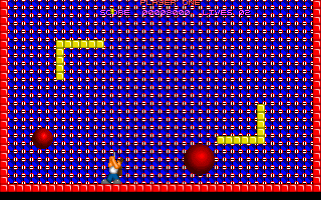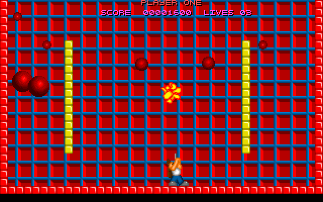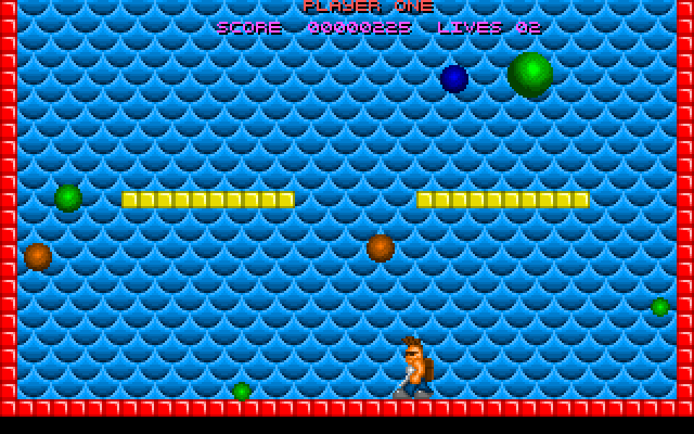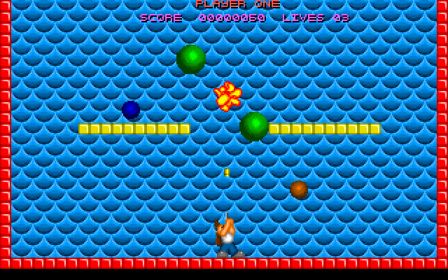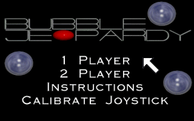 Bubble Jeopardy is a simple clone of Pang for one or two players. The player character is located at the bottom of the screen and can walk left or right and shoot a gun straight up. Bouncing around the screen are balls of various sizes and colours, that explode into smaller balls and/or bonuses when hit with gunfire. The objective is to pop all balls while avoiding contact with them and with other hazards that may appear on the screen. The game was released as freeware.