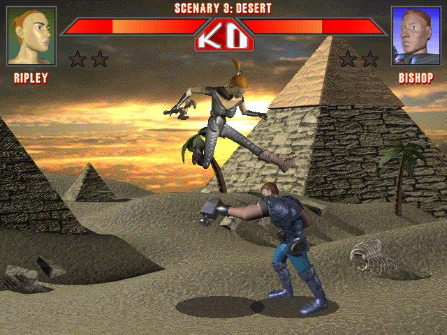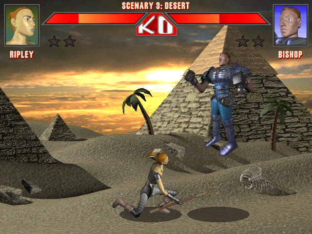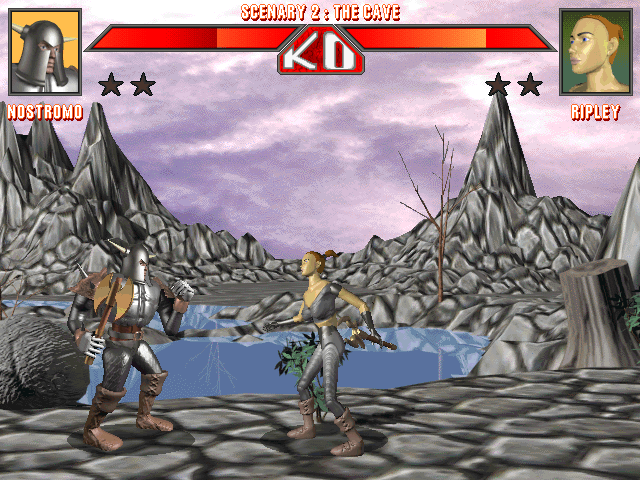 This is a simple versus fighting game that showcases what you can do with the DIV Games Studio development environment. There are only four fighters (named after characters from the Alien franchise, but bearing no resemblance to any of their film namesakes) and three stages. Fostiator uses high-resolution pre-rendered sprites for characters and backgrounds, but there are very few sound effects and no music. The entire source code and art assets of Fostiator were included on the DIV Games Studio CD, and the English version was made available from the official DIV website as a free download in the early 2000s.