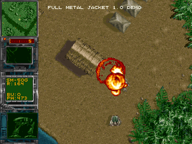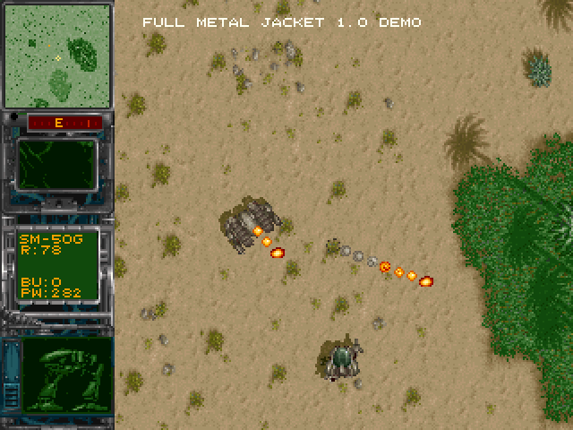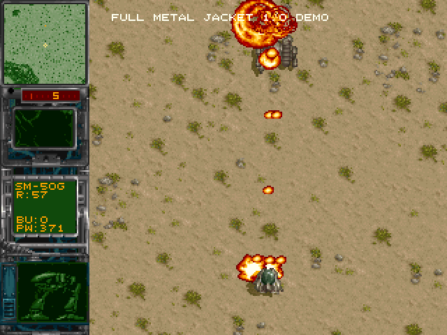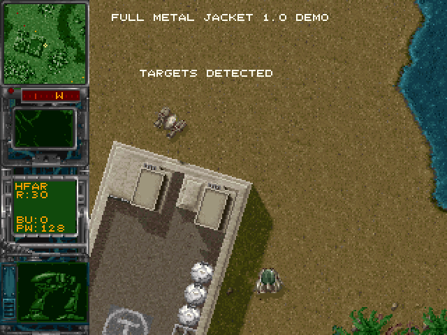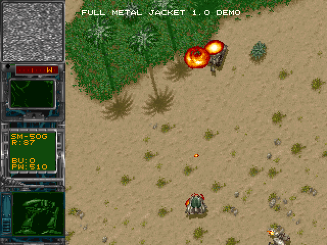 Full Metal Jacket is a top-down 360 degree shooter rather similar to Seek & Destroy but with a futuristic theme. You control a mecha robot and carry out solo missions in a global war of the future. Before each mission, the player needs to allocate credits on the necessary equipment, including mounted guns and ammo for them, missile launchers and a variety of bombs to be used against moving targets and installations. Accordingly, the missions vary from simply staying alive to the destruction of various enemy targets or even entire bases. During play, the onboard radar provides advance warning of incoming enemy robots, allowing the player to either avoid contact or engage them.
