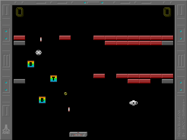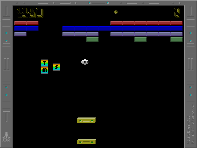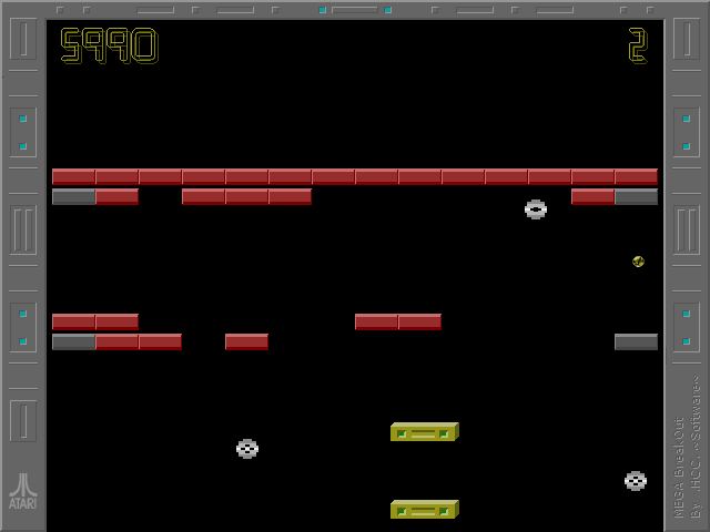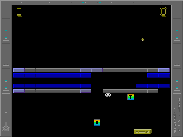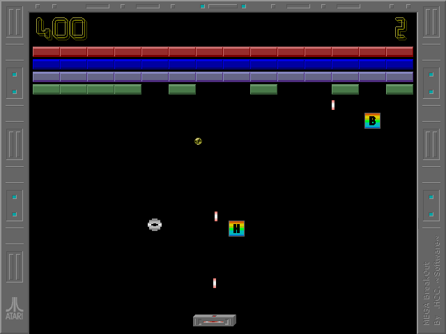 Mega Breakout is a very competently done Breakout clone with high-resolution graphics and smooth animations. The DOS version was created with DIV Games Studio. A Windows version is also available.