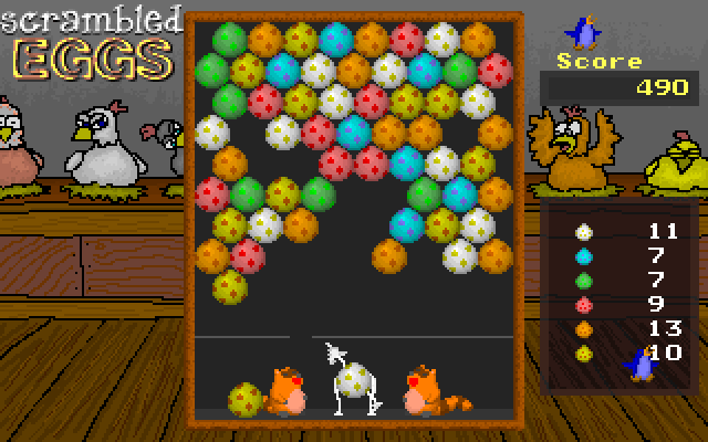 Scrambled Eggs is an arcade puzzle game similar to Puzzle Bobble/Bust-A-Move. The player needs to launch coloured eggs on the field so that three or more of the same colour connect, at which point they hatch and disappear from the screen. The objective is to remove all eggs from the playing field and not allow any of them to cross the line at the bottom of the screen.